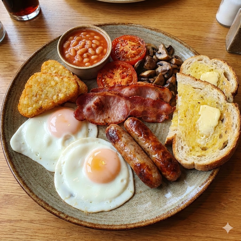 2 Fried Eggs, 2 Sausages, 2 Bacon, 2 Hash Browns